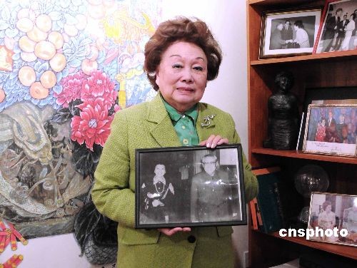 在纪念廖承志诞辰一百周年的日子,美籍华人领袖陈香梅接受本社记者专访,回忆与堂舅廖承志先生的家庭往事。图为陈香梅向记者展示她珍藏二十八年的当年和廖公见面的合影。 中新社发 邱江波 摄